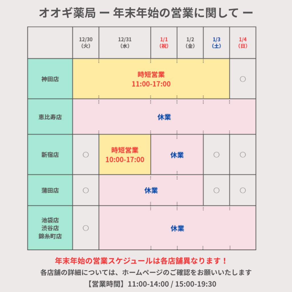 年末年始:1/1(祝)~1/2(金) ※12/31(水)は10:00~17:00の時短営業(昼休みなし)